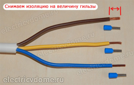 Следующим шагом после удаления изоляции будет одевание гильзы наконечника на изолированную часть провода. При этом предварительно правильно подобрав соответствующий диаметр НШВИ.