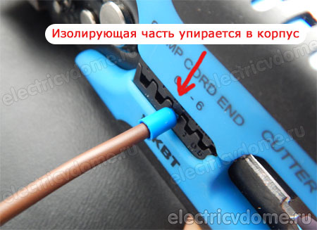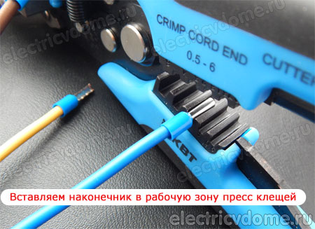Далее, сформированная из кабеля и наконечника конструкция, вставляется в паз пресс-клещей, также правильного размера, при этом изолированная часть наконечника, должна упереться в корпус пресс-клещей. И путем несложного нажатия на рукояти клещей процесс завершен. Теперь данное соединение готово к работе и подключению к электрооборудованию.