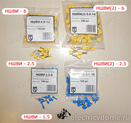 Кроме одинарных НШВИ наконечников, также существуют и двойные. В частности они предназначены для опрессовки двух проводов. Такие наконечники можно применять в тех случаях, когда требуется подключить к одной точке электрооборудования два разных провода. Процесс обжима таких наконечников ни чем не отличается от обжима одинарных НШВИ.